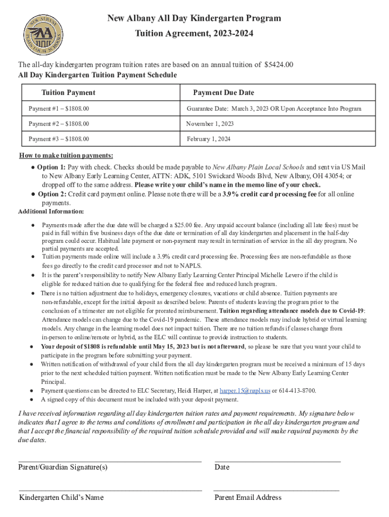 Get the free New Albany All Day Kindergarten Program Tuition Agreement ...