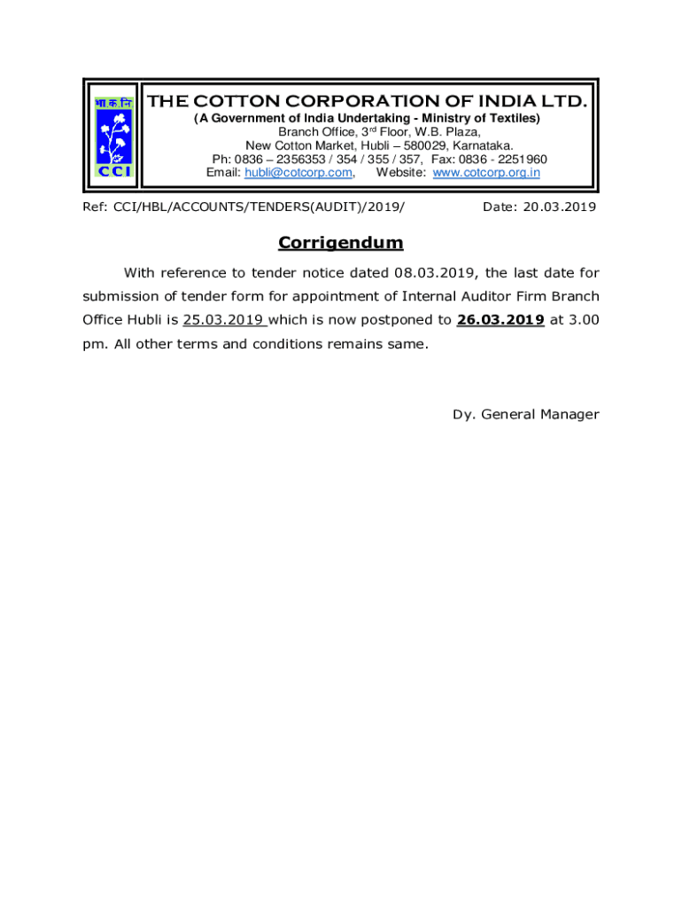 THE COTTON CORPORATION OF INDIA LTD. (A Government of India Undertaking Ministry of Textiles) Branch Office, 3rd Floor, W.B. Plaza, New Cotton Market, Hubei 580029, Karnataka. PH: 0836 2356353 / 354