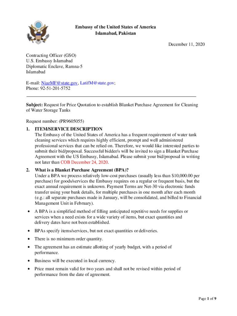 Embassy of the United States of America Islamabad, Pakistan December 11, 2020, Contracting Officer (GSO) U.S. Embassy Islamabad Diplomatic Enclave, Ramna5 Islamabad Email: NiazMF@state.gov, LatifM@state.gov;