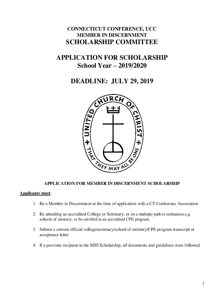 CONNECTICUT CONFERENCE, UCC MEMBER IN DISCERNMENTSCHOLARSHIP COMMITTEE APPLICATION FOR SCHOLARSHIP School Year 2019/2020 DEADLINE: JULY 29, 2019APPLICATION FOR MEMBER IN DISCERNMENT SCHOLARSHIP Applicants