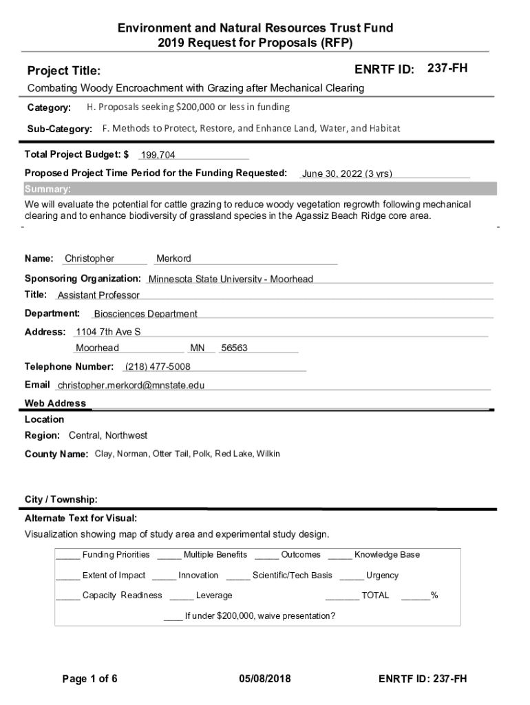 Environment and Natural Resources Trust Fund 2019 Request for Proposals (RFP) EN RTF ID:Project Title:237FHCombating Woody Encroachment with Grazing after Mechanical Clearing Category:H. Proposalsseeking$200,000orlessinfundingSubCategory:F.