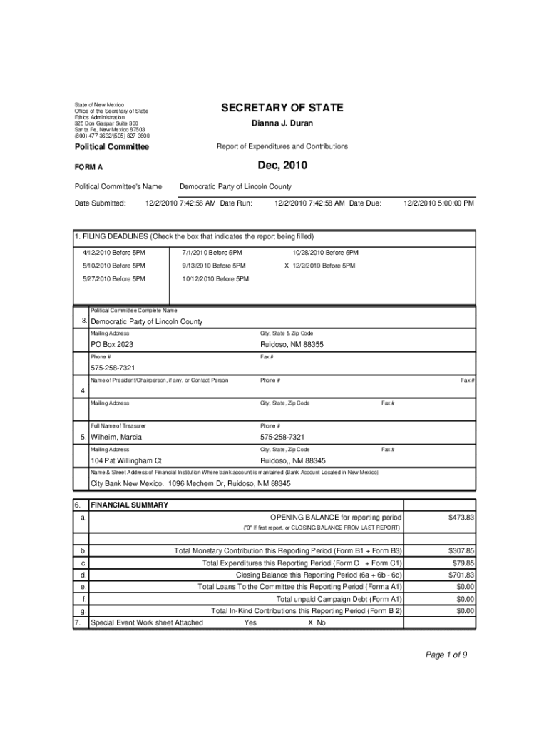 State of New Mexico Office of the Secretary of State Ethics Administration 325 Don Gaspar Suite 300 Santa Fe, New Mexico 87503 (800) 4773632/(505) 8273600SECRETARY OF STATEPolitical CommitteeReport