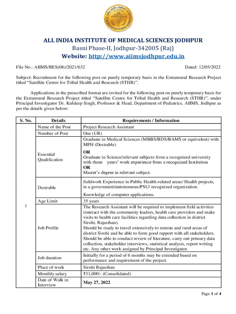 ALL INDIA INSTITUTE OF MEDICAL SCIENCES JODHPUR Basin Phase, Jodhpur342005 (Raj) Website: http://www.aiimsjodhpur.edu.in File No.: AIMS/RES(08)/2021/632Dated: 12/05/2022Subject: Recruitment for the