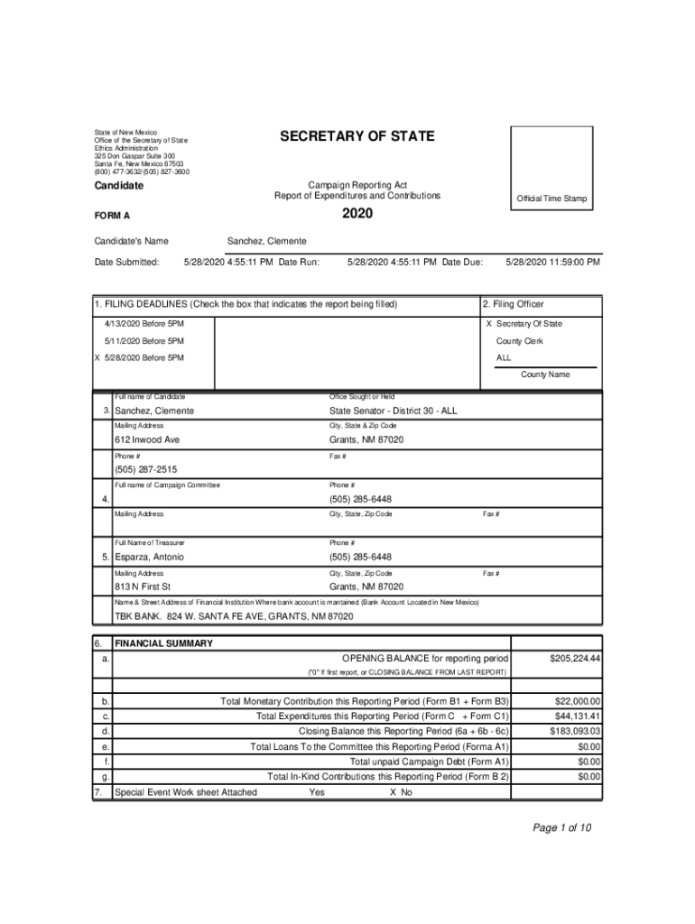 State of New Mexico Office of the Secretary of State Ethics Administration 325 Don Gaspar Suite 300 Santa Fe, New Mexico 87503 (800) 4773632/(505) 8273600SECRETARY OF STATECampaign Reporting Act Report