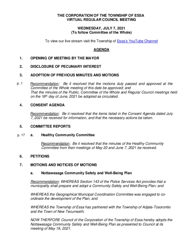 THE CORPORATION OF THE TOWNSHIP OF ESSAY VIRTUAL REGULAR COUNCIL MEETING WEDNESDAY, JULY 7, 2021 (To follow Committee of the Whole) To view our live stream visit the Township of Essay YouTube Channel