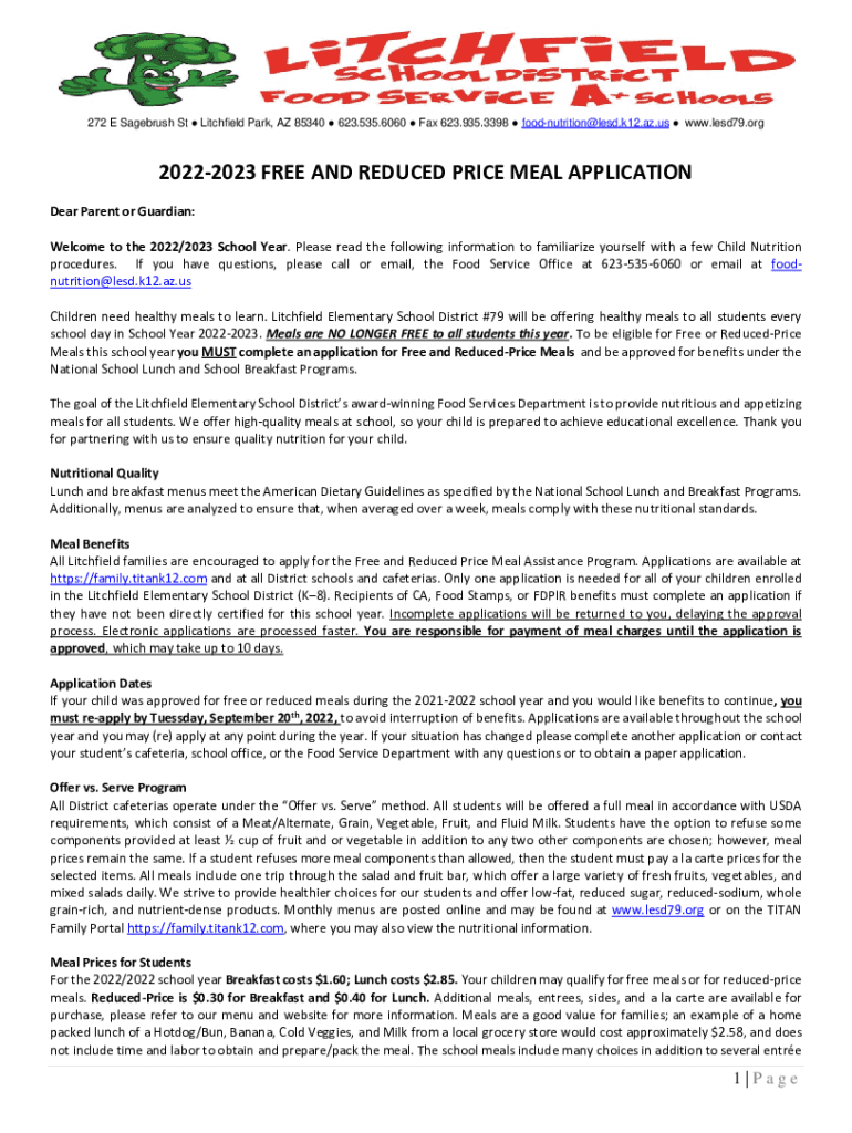 272 E Sagebrush St Litchfield Park, AZ 85340 623.535.6060 Fax 623.935.3398 foodnutrition@lesd.k12.az.us www.lesd79.org20222023 FREE AND REDUCED PRICE MEAL APPLICATION Dear Parent or Guardian: Welcome