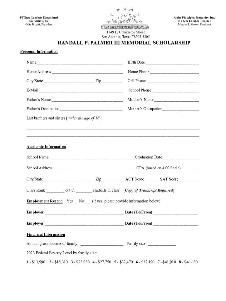 RANDALL P. PALMER III MEMORIAL SCHOLARSHIP Application Theta Lambda Educational Foundation, Inc. 1149 E. Commerce Street San Antonio, Texas 782053305Biography of Randall Par ham Palmer, III, J.D.