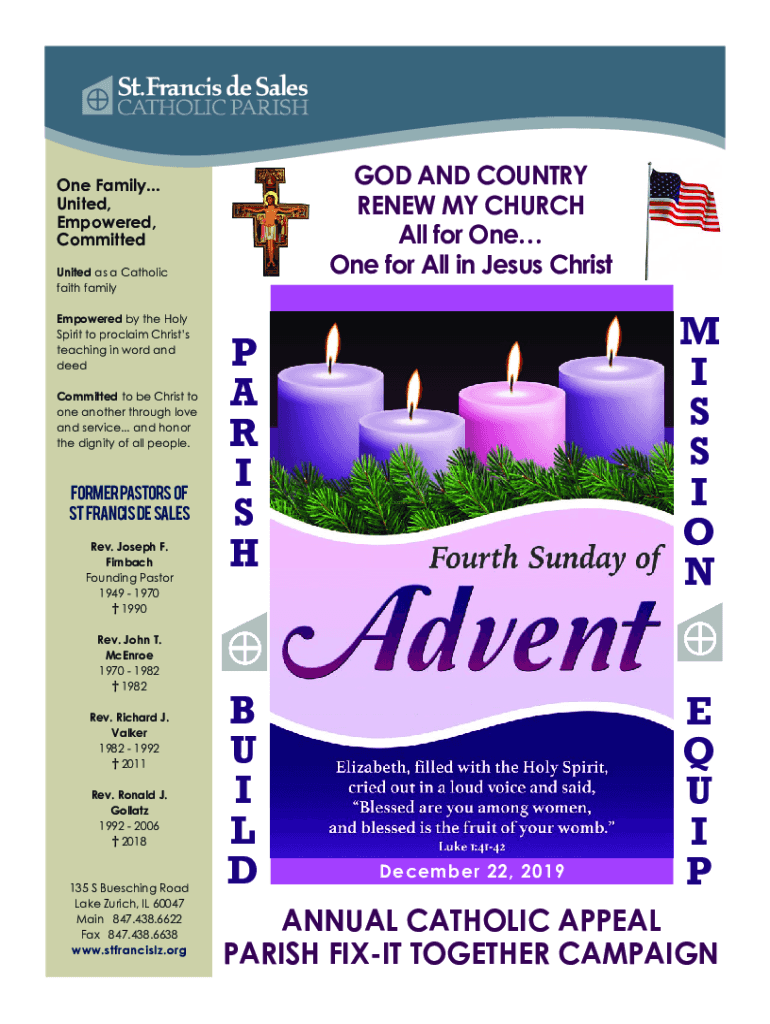 GOD AND COUNTRY RENEW MY CHURCH All for One for All in Jesus Christine Family... United, Empowered, Committed United as a Catholic faith family Empowered by the Holy Spirit to proclaim Christs teaching