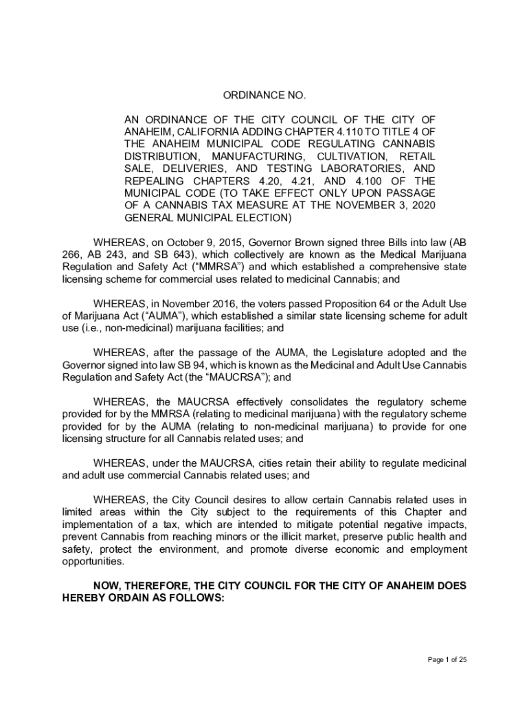 ORDINANCE NO. AN ORDINANCE OF THE CITY COUNCIL OF THE CITY OF ANAHEIM, CALIFORNIA ADDING CHAPTER 4.110 TO TITLE 4 OF THE ANAHEIM MUNICIPAL CODE REGULATING CANNABIS DISTRIBUTION, MANUFACTURING, CULTIVATION,