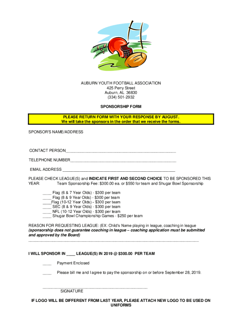 AUBURN YOUTH FOOTBALL ASSOCIATION 425 Perry Street Auburn, AL 36830 (334) 5012932 SPONSORSHIP FORM PLEASE RETURN FORM WITH YOUR RESPONSE BY AUGUST. We will take the sponsors in the order that we receive