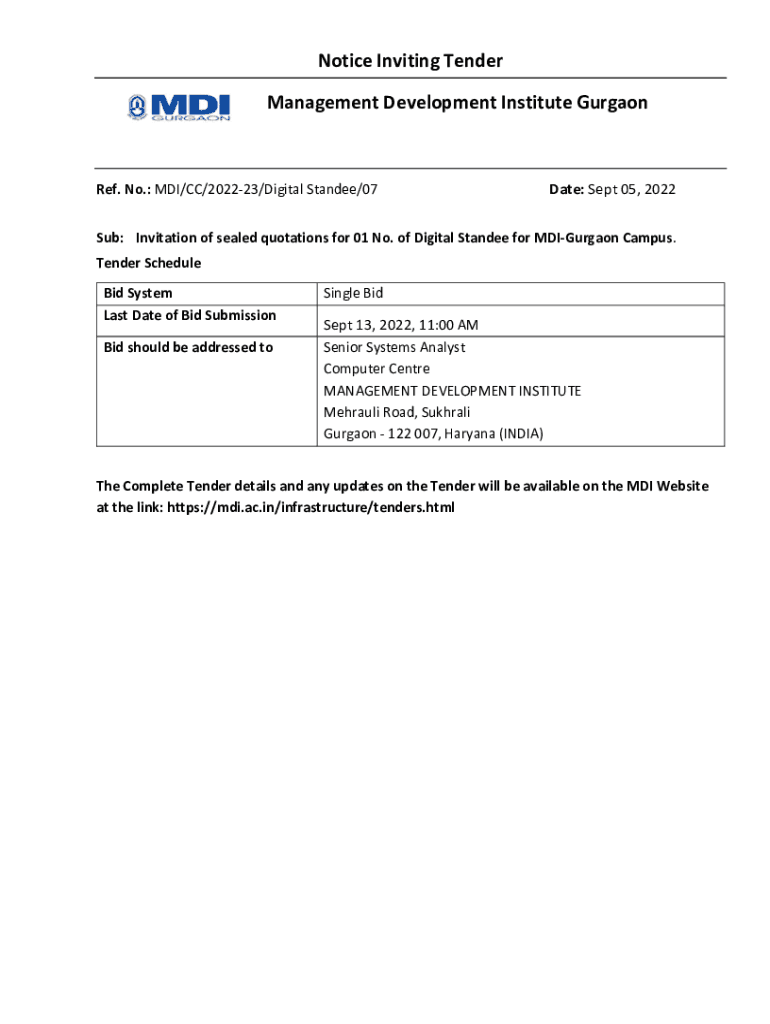 Notice Inviting Tender Management Development Institute Gurgaon. No.: MDI/CC/202223/Digital Standee/07Date: Sept 05, 2022Sub: Invitation of sealed quotations for 01 No. of Digital Standee for Gurgaon