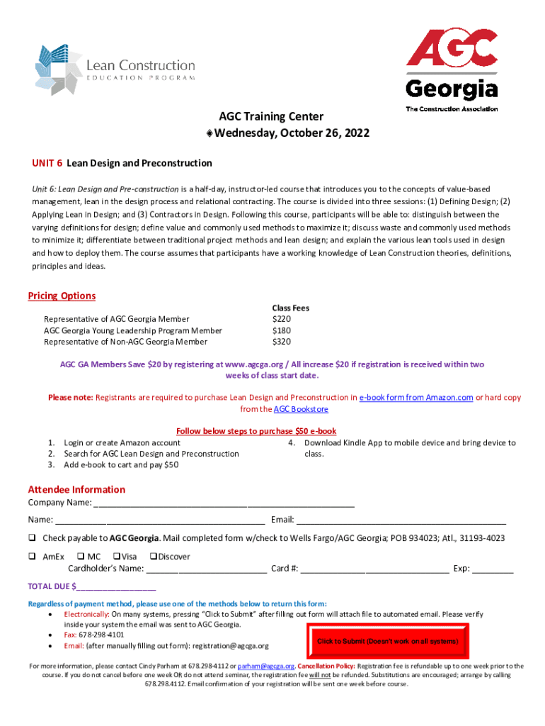 UNIT 6 Lean Design and Preconstruction AGC Training Center 1940 The Exchange, Atlanta, 30339 8:00 am 12:00 pm on the following date: Wednesday, October 26, 2022, Everyone related to the construction