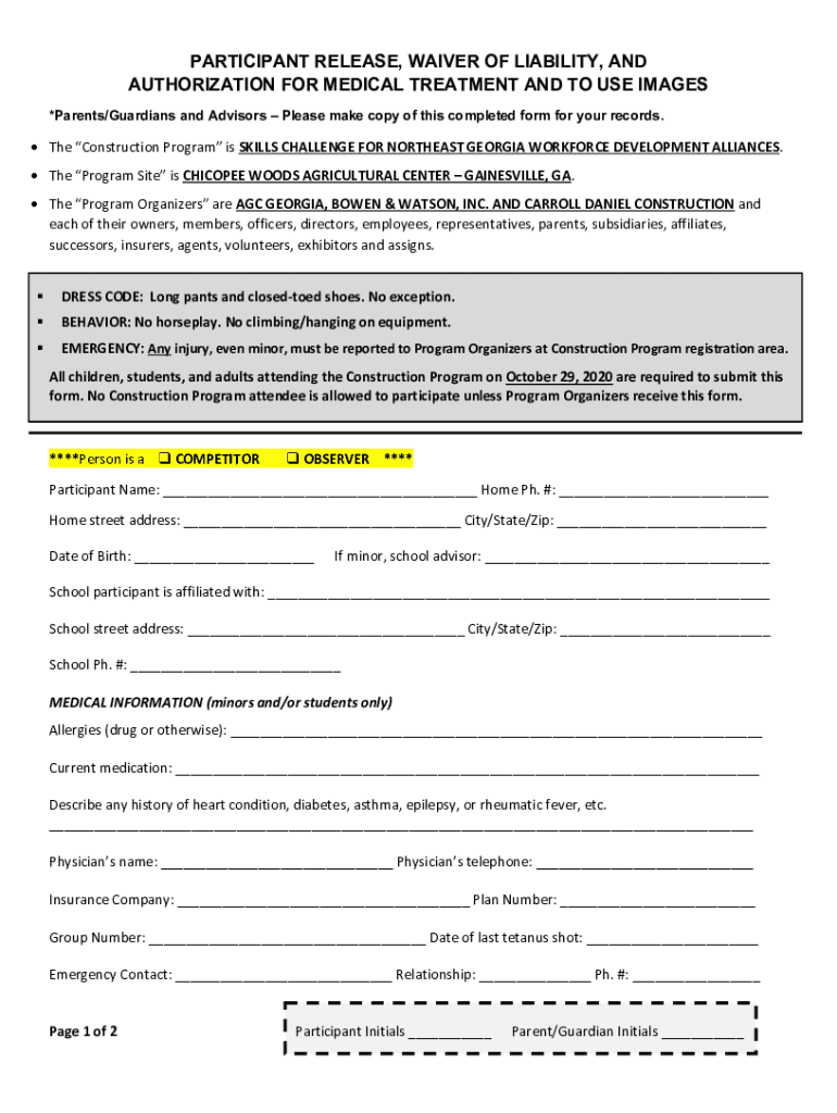 PARTICIPANT RELEASE, WAIVER OF LIABILITY, AND AUTHORIZATION FOR MEDICAL TREATMENT AND TO USE IMAGES *Parents/Guardians and Advisors Please make copy of this completed form for your records. The Construction
