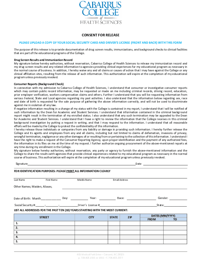 CONSENT FOR RELEASE PLEASE UPLOAD A COPY OF YOUR SOCIAL SECURITY CARD AND Driver's LICENSE (FRONT AND BACK) WITH THIS FORM The purpose of this release is to provide documentation of drug screen results,