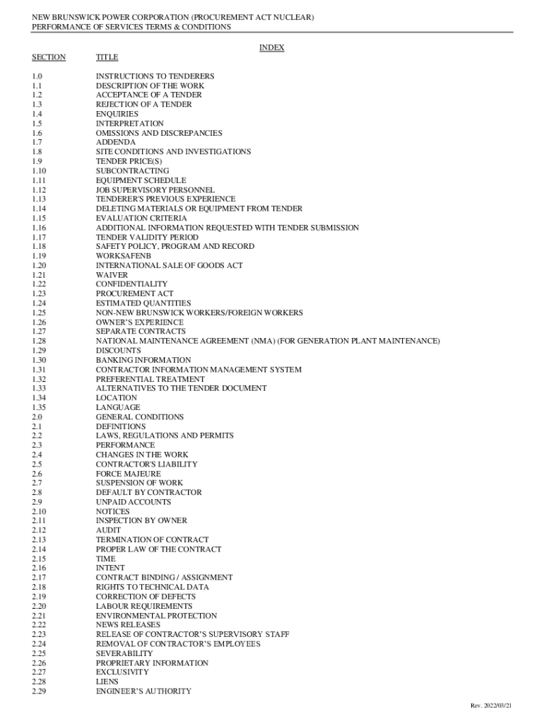NEW BRUNSWICK POWER CORPORATION (PROCUREMENT ACT NUCLEAR) PERFORMANCE OF SERVICES TERMS & CONDITIONS INDEX SECTIONTITLE1.0 1.1 1.2 1.3 1.4 1.5 1.6 1.7 1.8 1.9 1.10 1.11 1.12 1.13 1.14 1.15 1.16 1.17