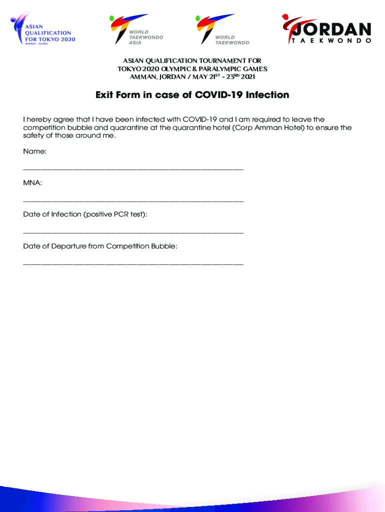 ASIAN QUALIFICATION TOURNAMENT FOR TOKYO 2020 OLYMPIC & PARALYMPIC GAMES AMMAN, JORDAN / MAY 21ST 23RD 2021Exit Form in case of COVID-19 Infection I hereby agree that I have been infected with COVID-19,
