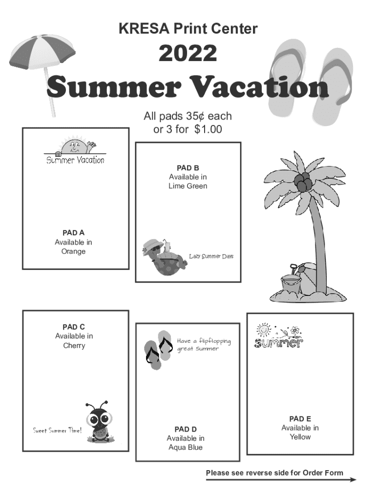 KR ESA Print Center2022Summer Vacation All pads 35 each or 3 for $1.00 PAD B Available in Lime Greenland A Available in Orangeade C Available in Cherry Sweet Summer! Lazy Summer Shave a flip-flopping