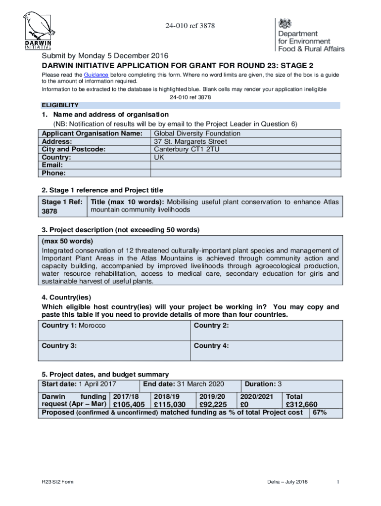 24010 ref 3878Submit by Monday 5 December 2016 DARWIN INITIATIVE APPLICATION FOR GRANT FOR ROUND 23: STAGE 2 Please read the Guidance before completing this form. Where no word limits are given, the