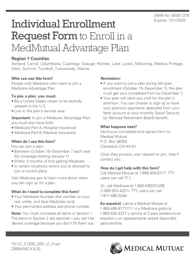 Individual Enrollment Request Form to Enroll in bomb No: 09381378 Expires: 7/31/2023MedMutual Advantage Plan Region 1 CountiesAshland, Carroll, Columbian, Cuyahoga, Gauge, Holmes, Lake, Lorain, Mahoning,