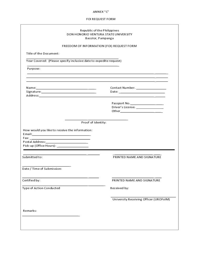ANNEX C FOR REQUEST FORMRepublic of the Philippines DON HONOR VENTURA STATE UNIVERSITY Ba color, Campaign FREEDOM OF INFORMATION (FOR) REQUEST FORM Title of the Document: Year Covered: (Please specify
