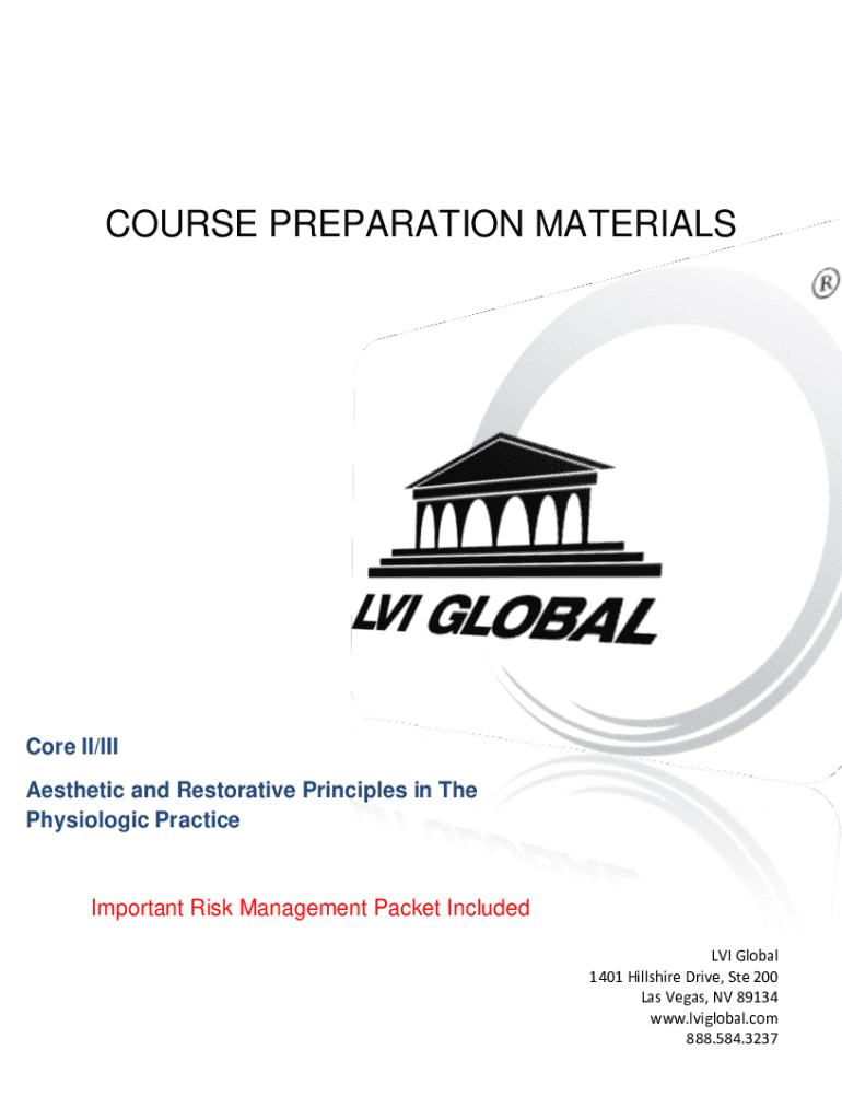 COURSE PREPARATION MATERIALSCore II/III Aesthetic and Restorative Principles in The Physiologic PracticeImportant Risk Management Packet Included LVI Global 1401 Hill shire Drive, Ste 200 Las Vegas,