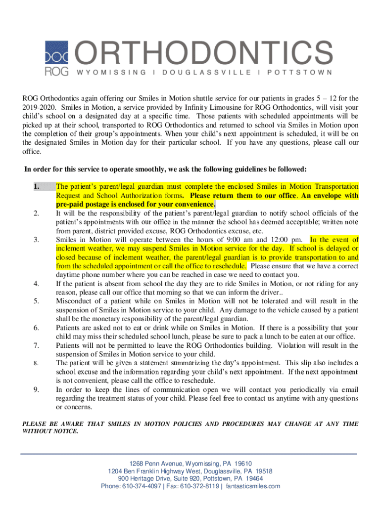 DOG Orthodontics again offering our Smiles in Motion shuttle service for our patients in grades 5 12 for the 20192020. Smiles in Motion, a service provided by Infinity Limousine for DOG Orthodontics,