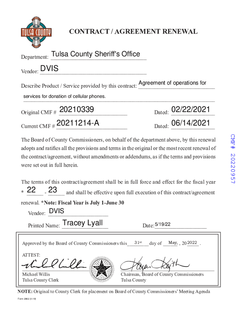 CONTRACT / AGREEMENT RENEWAL Tulsa County Sheriff\'s Office Department:___DAVIS Vendor:___ Agreement of operations for Describe Product / Service provided by this contract:___ services for donation