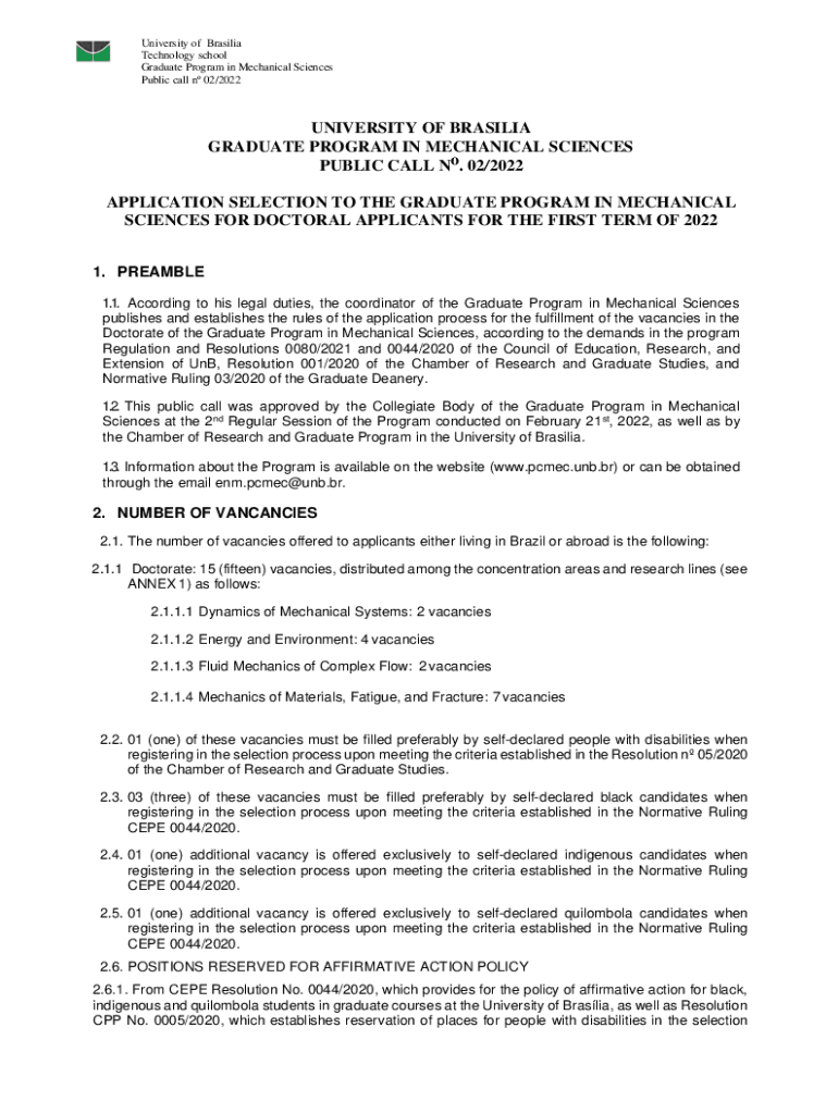 University of Brasília Technology school Graduate Program in Mechanical Sciences Public call n 02/2022UNIVERSITY OF Brasília GRADUATE PROGRAM IN MECHANICAL SCIENCES PUBLIC CALL No. 02/2022 APPLICATION