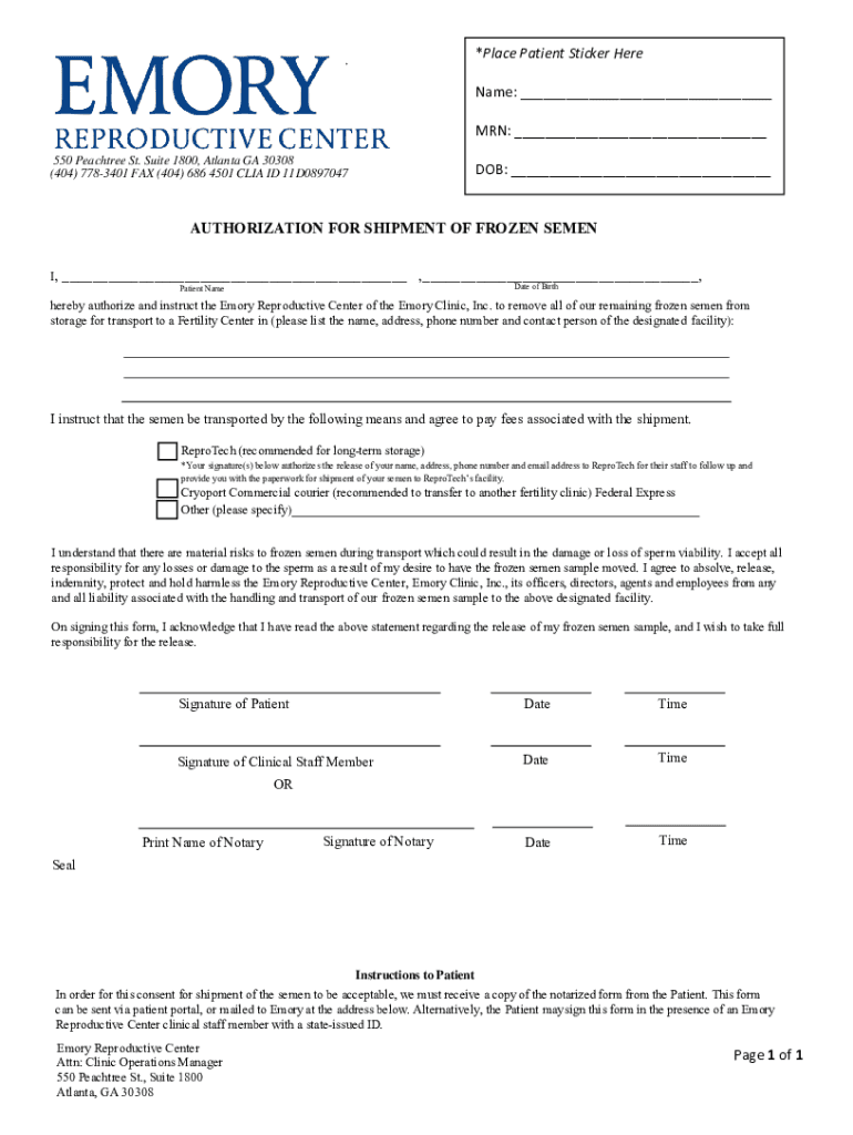 *Place Patient Sticker Here. Name: ___ MAN: ___ 550 Peach tree St. Suite 1800, Atlanta GA 30308 (404) 7783401 FAX (404) 686 4501 CLI AID 11D0897047DOB: ___AUTHORIZATION FOR SHIPMENT OF FROZEN SEMEN