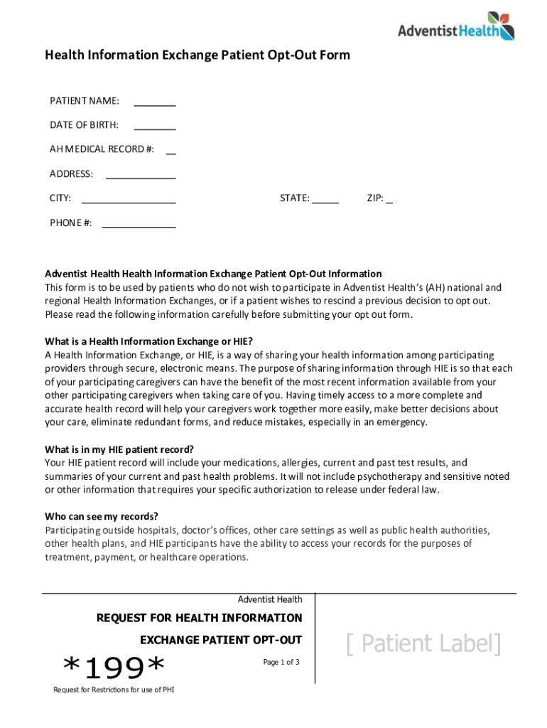 Health Information Exchange Patient Opt-out Form PATIENT NAME: DATE OF BIRTH: AH MEDICAL RECORD #: ADDRESS: CITY:STATE:ZIP:PHONE #:Adventist Health, Health Information Exchange Patient Opt-out Information