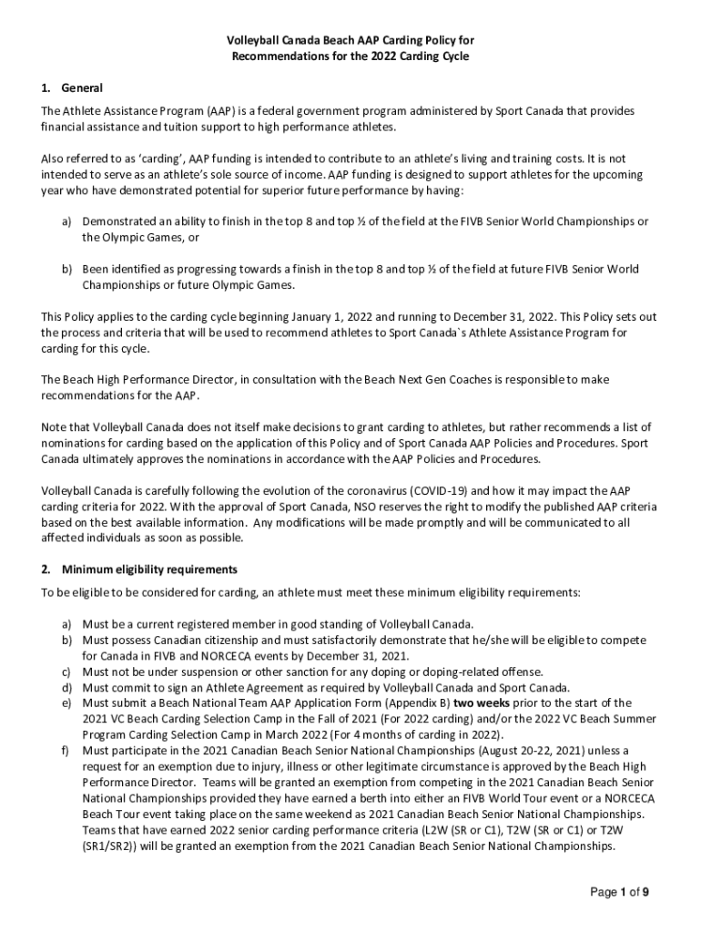 Volleyball Canada Beach AAP Carding Policy for Recommendations for the 2022 Carding Cycle 1. General The Athlete Assistance Program (AAP) is a federal government program administered by Sport Canada