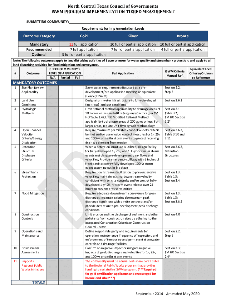 North Central Texas Council of Governments ISAM PROGRAM IMPLEMENTATION TIERED MEASUREMENT SUBMITTING COMMUNITY: Requirements for Implementation LevelsOutcome CategoryGoldSilverBronzeMandatory Recommended