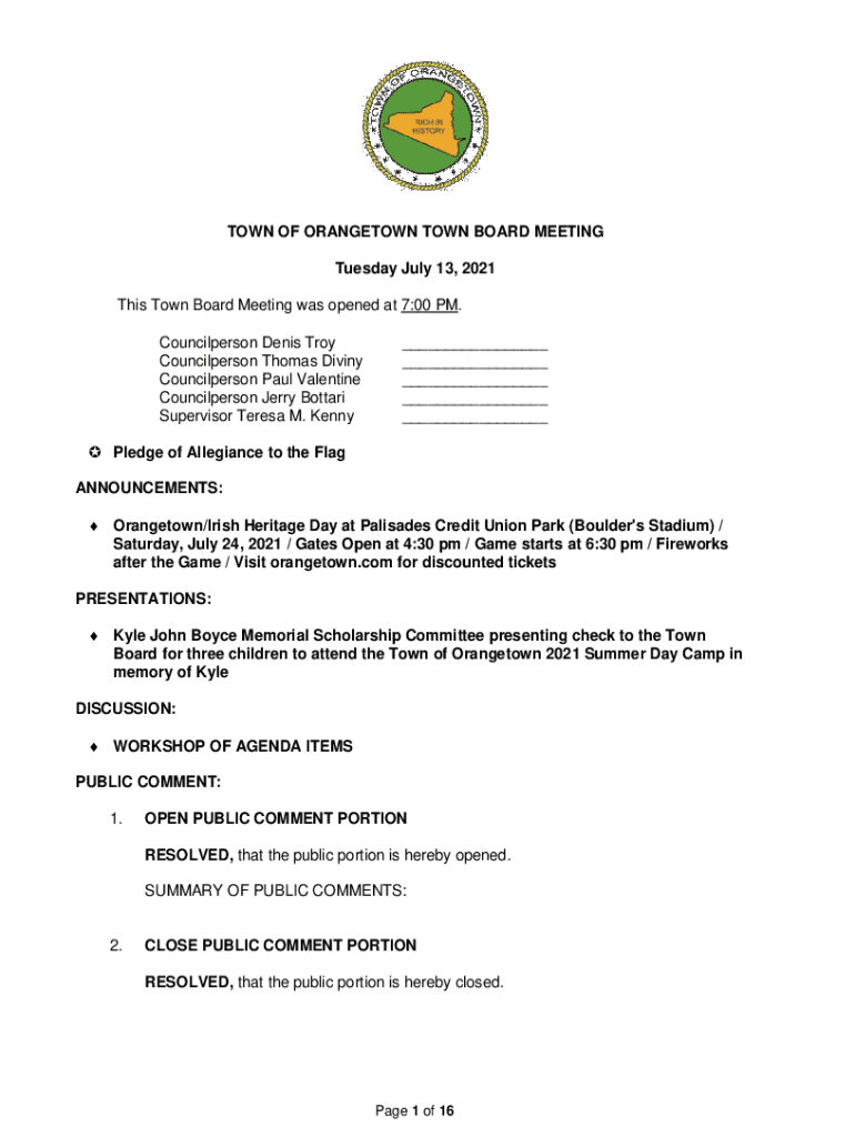TOWN OF ORANGUTAN TOWN BOARD MEETING Tuesday, July 13, 2021, This Town Board Meeting was opened at 7:00 PM. Councilperson Denis Troy Councilperson Thomas Divine Councilperson Paul Valentine Councilperson