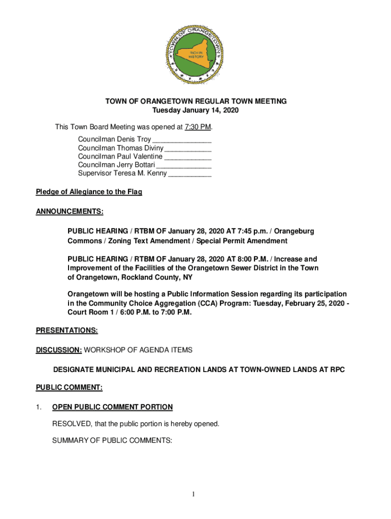 TOWN OF ORANGUTAN REGULAR TOWN MEETING Tuesday, January 14, 2020, This Town Board Meeting was opened at 7:30 PM. Councilman Denis Troy ___ Councilman Thomas Divine ___ Councilman Paul Valentine ___
