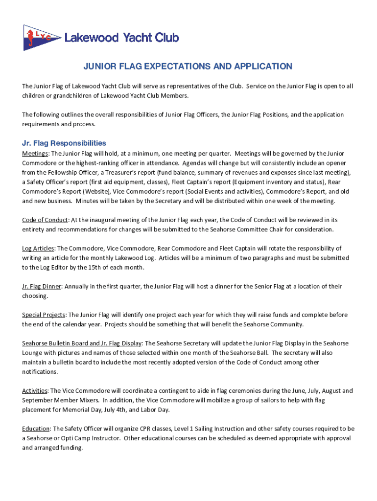 JUNIOR FLAG EXPECTATIONS AND APPLICATION The Junior Flag of Lakewood Yacht Club will serve as representatives of the Club. Service on the Junior Flag is open to all children or grandchildren of Lakewood