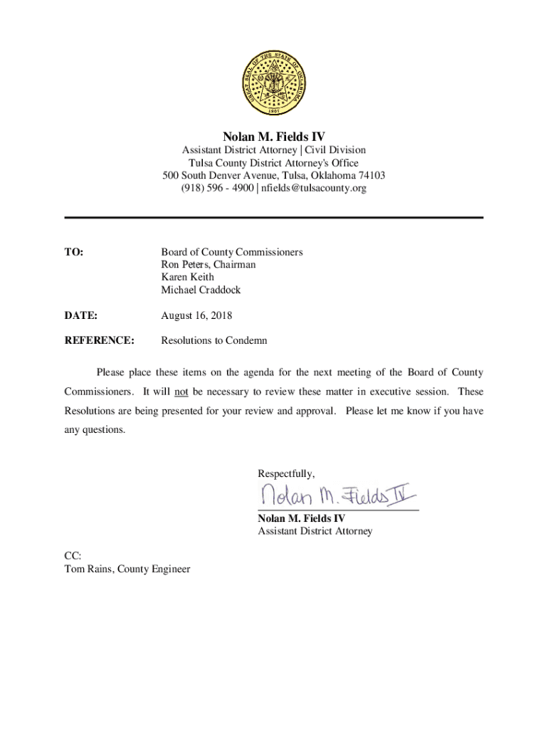 Nolan M. Fields IV Assistant District Attorney | Civil Division Tulsa County District Attorney\'s Office 500 South Denver Avenue, Tulsa, Oklahoma 74103 (918) 596 4900 | nfields@tulsacounty.orgTO:Board