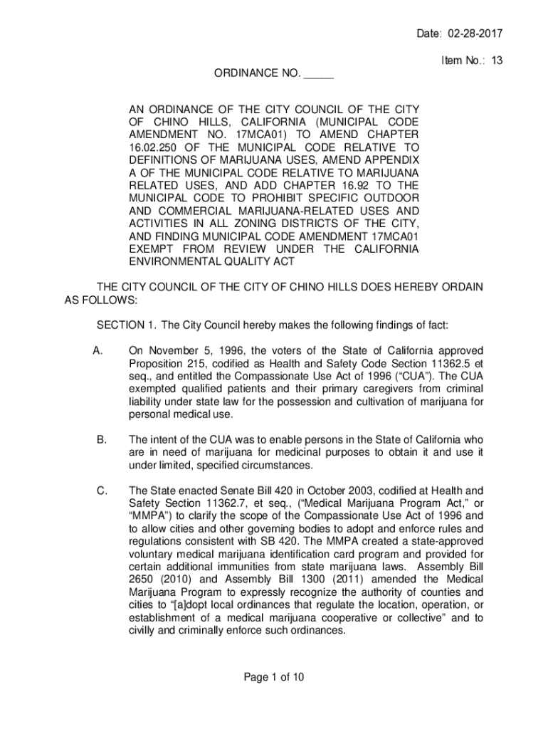 Date: 02282017 Item No.: 13 ORDINANCE NO. ___ AN ORDINANCE OF THE CITY COUNCIL OF THE CITY OF CHINO HILLS, CALIFORNIA (MUNICIPAL CODE AMENDMENT NO. 17MCA01) TO AMEND CHAPTER 16.02.250 OF THE MUNICIPAL