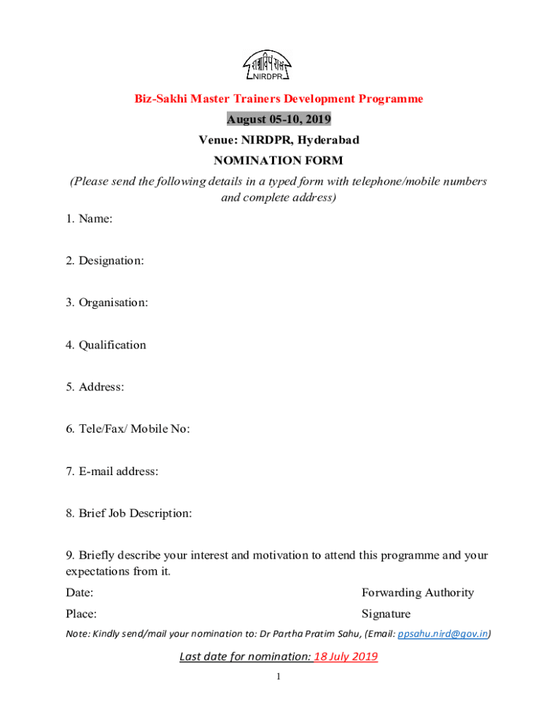 The nirdpr hyderabad nomination form typically requires information such as name, contact details, educational background, work experience, and reasons for applying for the program or position.