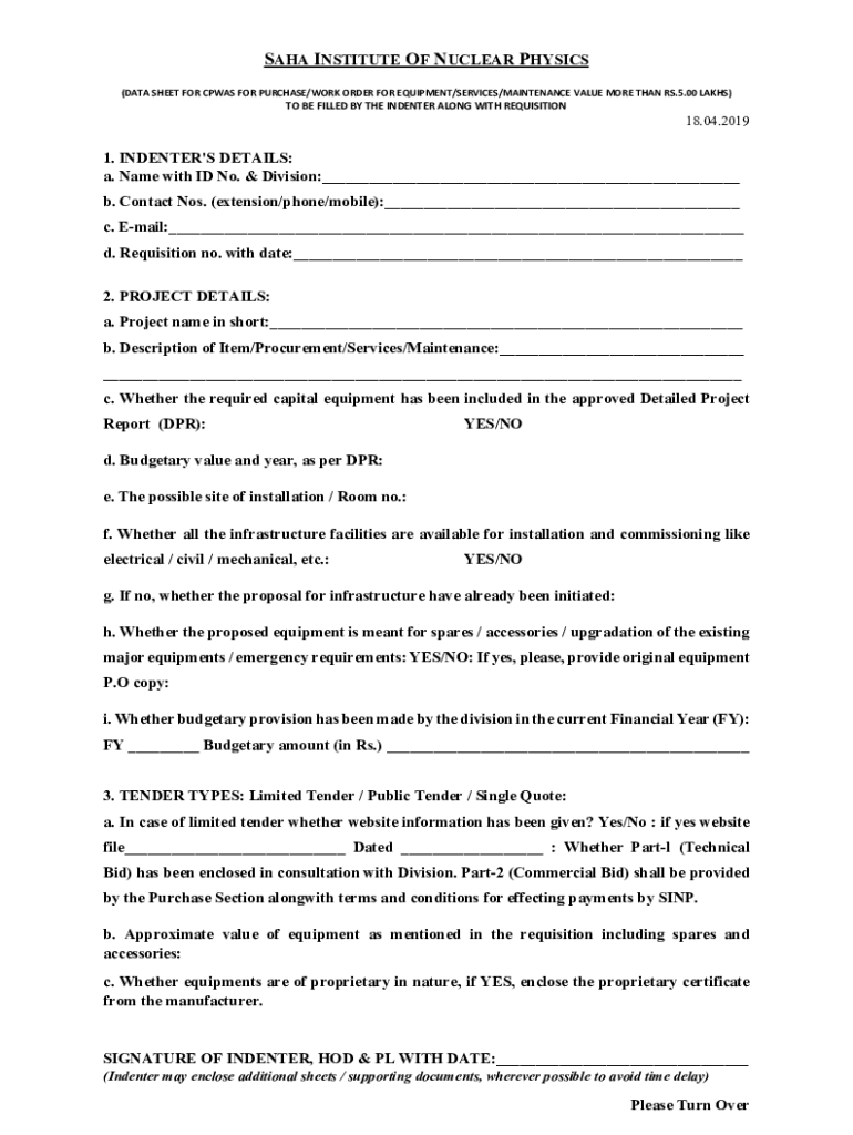 SAGA INSTITUTE OF NUCLEAR PHYSICS (DATA SHEET FOR PWAs FOR PURCHASE/WORK ORDER FOR EQUIPMENT/SERVICES/MAINTENANCE VALUE MORE THAN RS.5.00 LAKHS)TO BE FILLED BY THE INDENTED ALONG WITH REQUISITION18.04.20191.