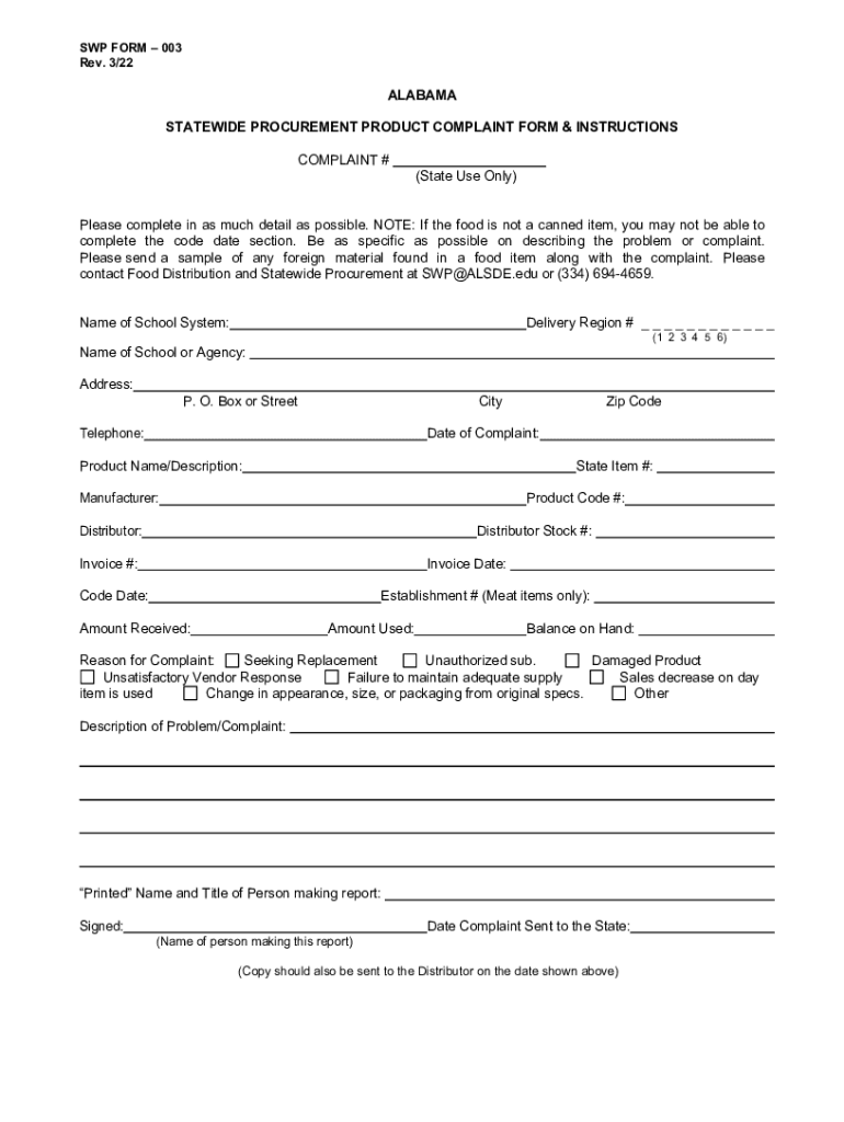 SVP FORM 003 Rev. 3/22ALABAMA STATEWIDE PROCUREMENT PRODUCT COMPLAINT FORM & INSTRUCTIONS COMPLAINT # (State Use Only) Please complete in as much detail as possible. NOTE: If the food is not a canned
