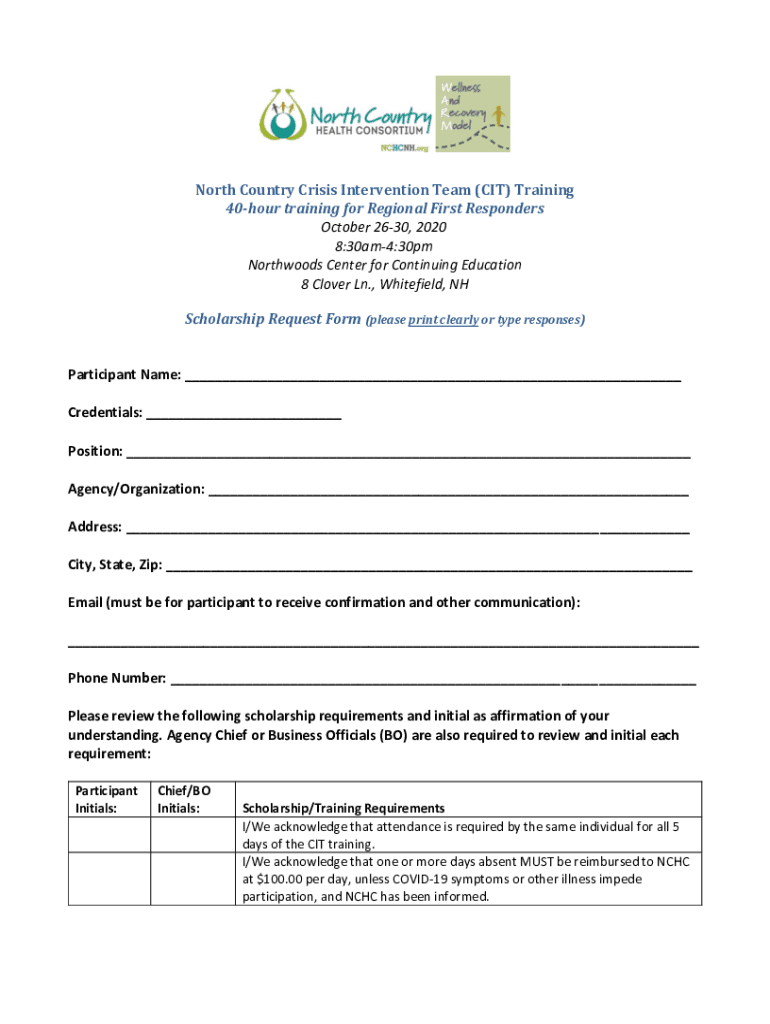 North Country Crisis Intervention Team (CIT) Training 40hour training for Regional First Responders October 2630, 2020 8:30am4:30pm North woods Center for Continuing Education 8 Clover Ln., Whitefield,