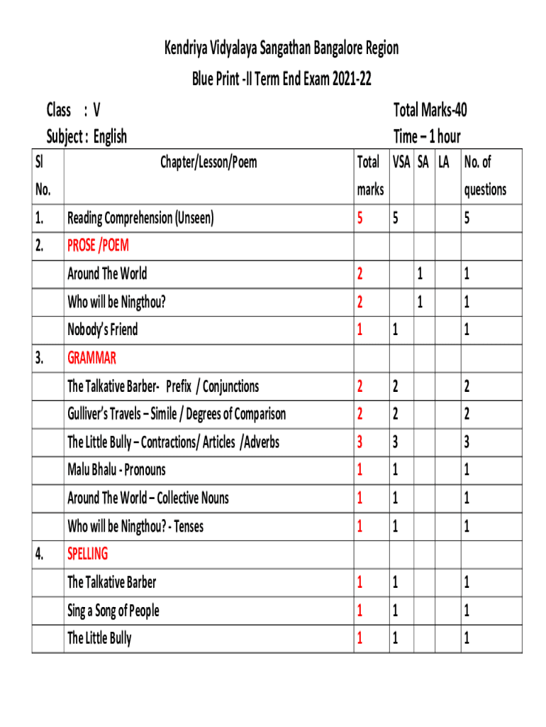 Class : V Subject : English SL No. 1. 2.3.4. Kendra Himalaya Jonathan Bangalore Region blueprint II Term End Exam 202122 Total Marks40 Time 1 hour Chapter/Lesson/Poem Reading Comprehension (Unseen)
