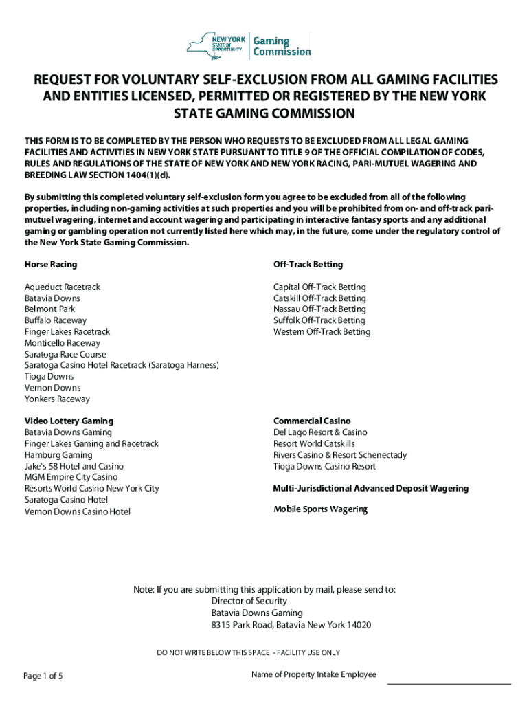 REQUEST FOR VOLUNTARY SELFEXCLUSION FROM ALL GAMING FACILITIES AND ENTITIES LICENSED, PERMITTED OR REGISTERED BY THE NEW YORK STATE GAMING COMMISSION THIS FORM IS TO BE COMPLETED BY THE PERSON WHO