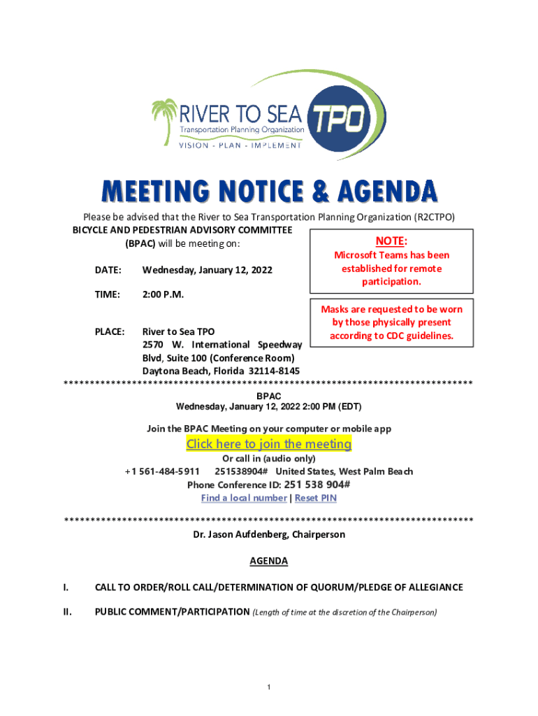 MEETING NOTICE & Agendaless be advised that the River to Sea Transportation Planning Organization (R2CTPO) B ICY CL E AN D PEDESTAL IAN ADVISOR Y COM M IT TEE N ONE: (B PAC) will be meeting on: M