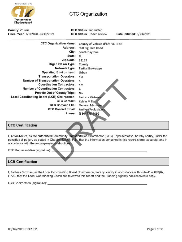 CTC Organization County: Völuspá Fiscal Year: 7/1/2020 6/30/2021CTC Status: Submitted CD Status: Under ReviewCounty of Völuspá d/b/a VETERAN 950 Big Tree Road South Daytona FL 32119 County Partial
