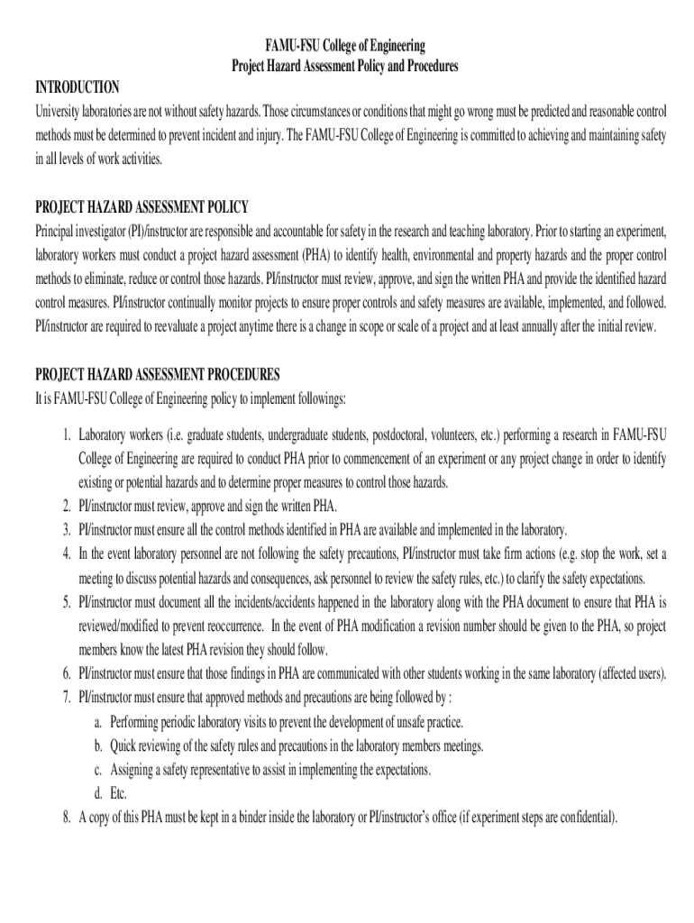 FAMOUS College of Engineering Project Hazard Assessment Policy and Procedures INTRODUCTION University laboratories are not without safety hazards. Those circumstances or conditions that might go wrong