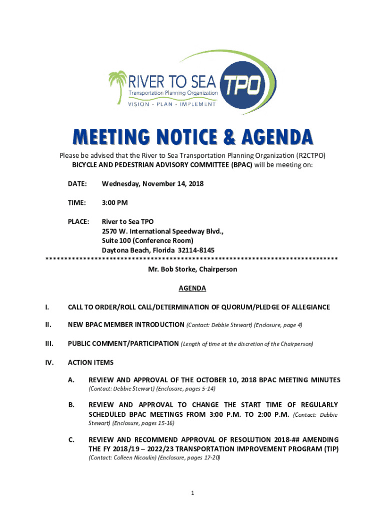 MEETING NOTICE & Agendaless be advised that the River to Sea Transportation Planning Organization (R2CTPO) BICYCLE AND PEDESTRIAN ADVISORY COMMITTEE (PAC) will be meeting on: DATE:Wednesday, November
