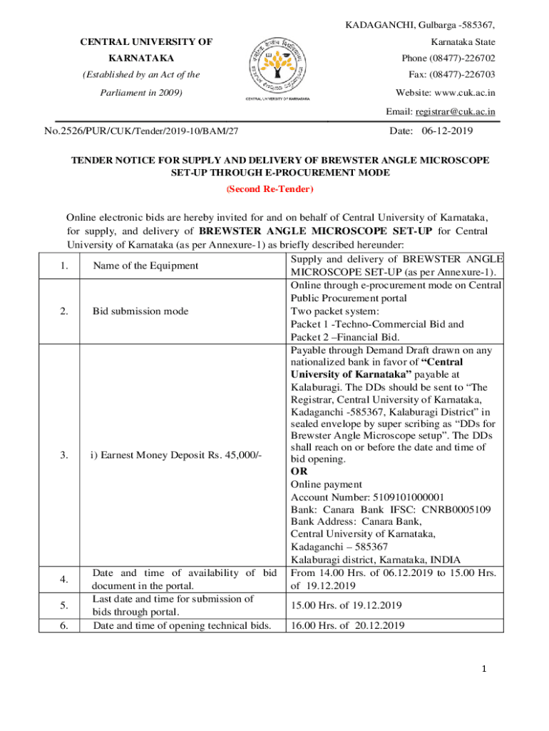 KADAGANCHI, Gulbarga 585367, CENTRAL UNIVERSITY Karnataka StateKARNATAKAPhone (08477)226702(Established by an Act of theft: (08477)226703Parliament in 2009)Website: www.cuk.ac.in Email: registrar@cuk.ac.inNo.2526/PUR/UK/Tender/201910/BAM/27Date: