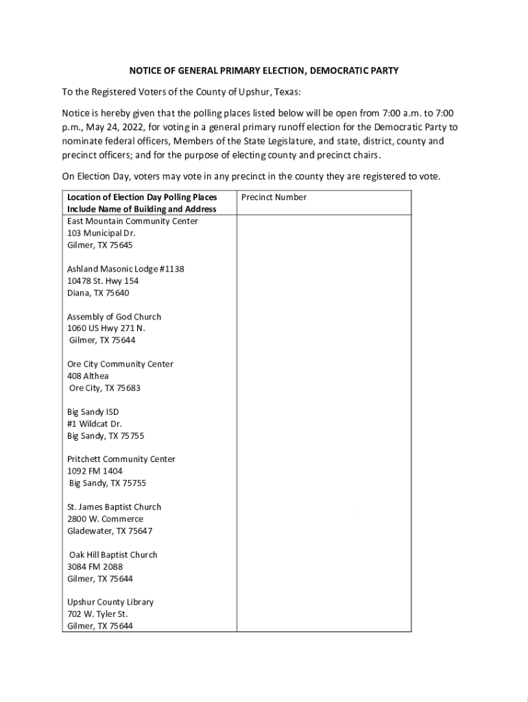 NOTICE OF GENERAL PRIMARY ELECTION, DEMOCRATIC PARTY To the Registered Voters of the County of Usher, Texas: Notice is hereby given that the polling places listed below will be open from 7:00 a.m.