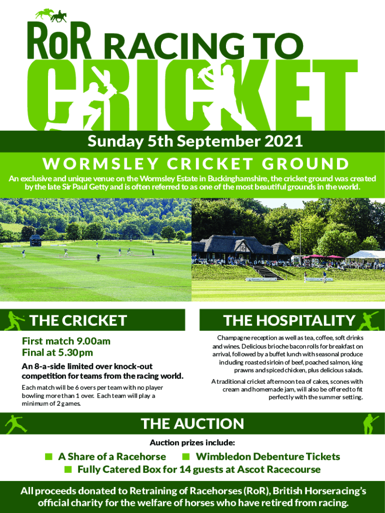 RACING TO Sunday 5th September 2021 WALMSLEY CRICKET GROUND An exclusive and unique venue on the Formula Estate in Buckingham shire, the cricket ground was created by the late Sir Paul Getty and is
